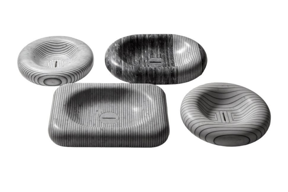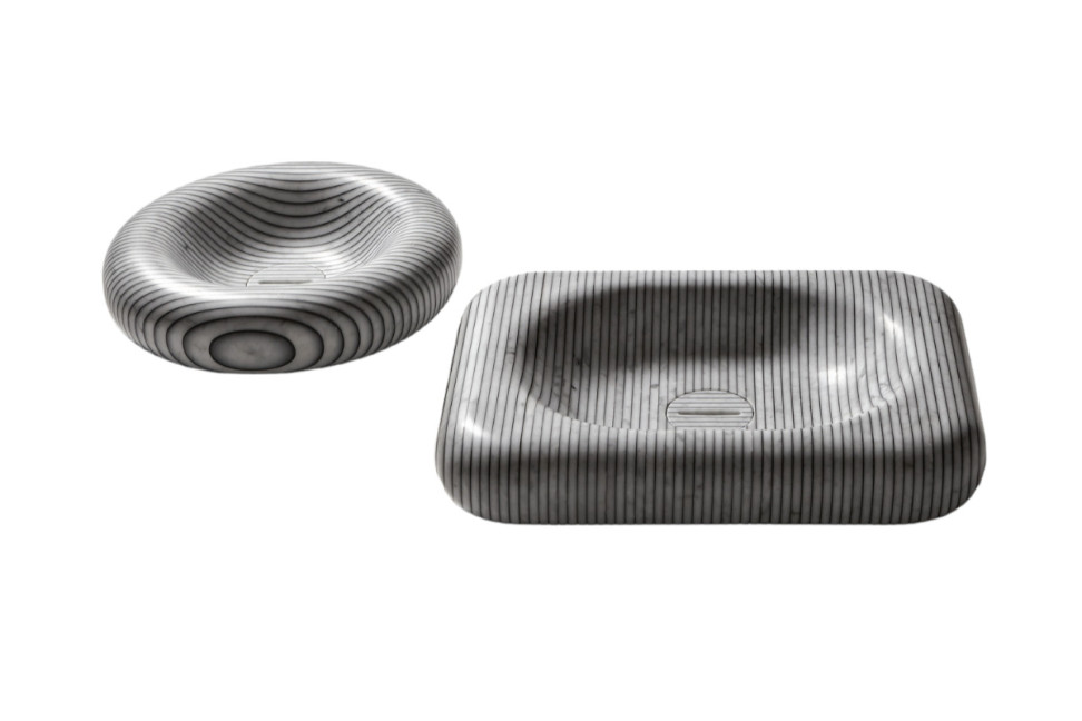 The characteristic feature of the Gessati sink collection proposed by Antoniolupi on a project by Gumdesign, is precisely that of the stripes, obtained from the juxtaposition of Carrara marble sheets, glued together using a coloured resin that creates chromatic contrast and a captivating optical effect. Each Gessati sink is unique, given the natural peculiarities of the marble that composes it; round, oval or rectangular, Gessati's striped motif lends vitality and character to the bathroom décor. The parallel lines intertwining on the curved surfaces create new angles and orientations, adding dynamism and personality to the room.