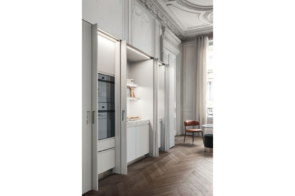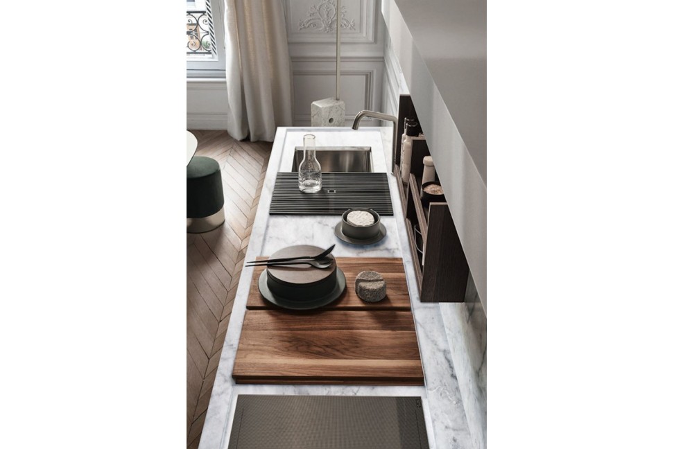 Beta kitchen is characterized by essential lines, designed to integrate in a functional way both in classic houses and in those with a contemporary character. This kitchen proposed by Arclinea has a base with doors equipped with horizontal handles, integrated along the length. Having a perfect configuration to make the most of longitudinal spaces, the Beta kitchen features on one side an operational wall, with top and back in matt Carrara marble, topped by a steel hood shelf; on the other side it has a containment wall, where you can find an additional work space, fridge, oven column and small appliances enclosed by retractable doors.