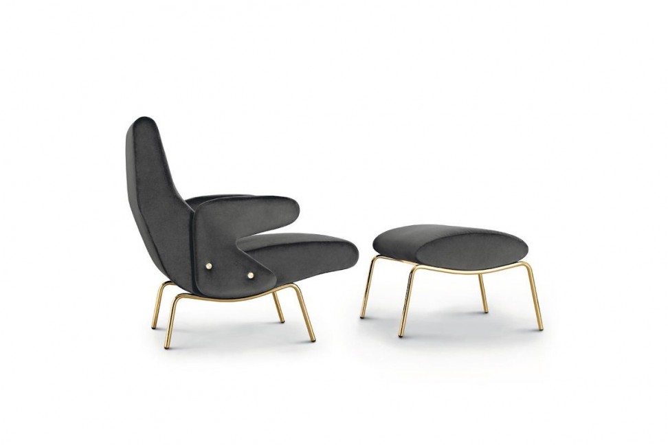 Considered one of the most significant examples of the so-called "organic" furniture of the 1950s, the Delfino armchair is designed by Erberto Carboni and presented by the Arflex brand. This armchair is characterized by a fluid design: the base is available in galvanic gold or black lacquered metal, and the upholstery is available in the fabrics and leathers of the extensive Arflex collection. For optimal comfort, the Delfino armchair can be accompanied by the pouf of the same line.