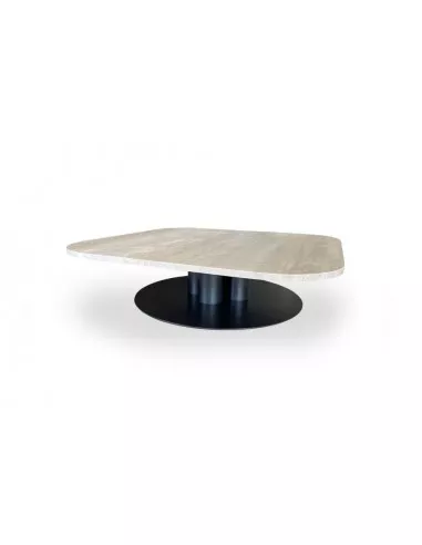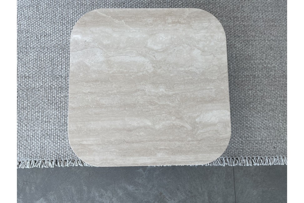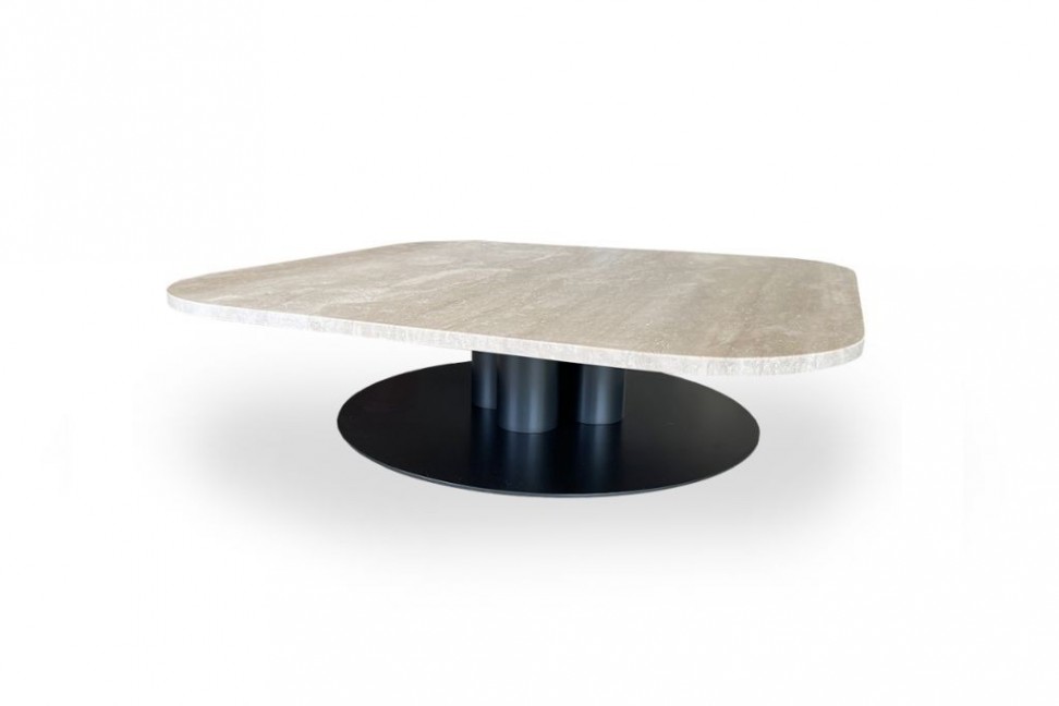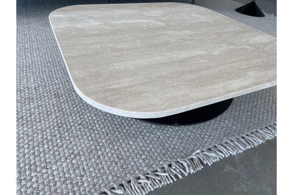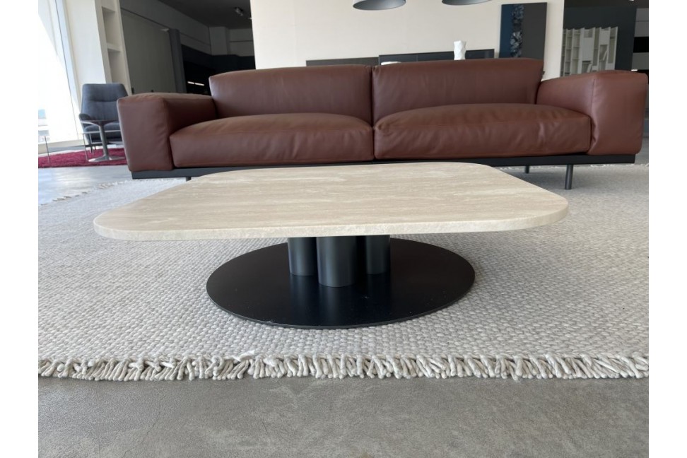 The Goya coffee table on Expo Offer in our showroom has a graphite lacquered metal base and a top in Travertino Romano marble.