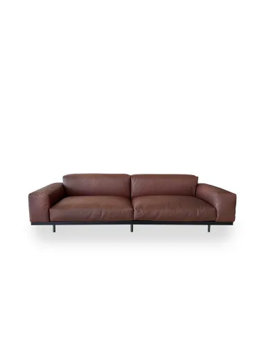 The Naviglio sofa on Expo Offer in our showroom is characterized by a graphite lacquered metal base and an elegant brown leather upholstery.