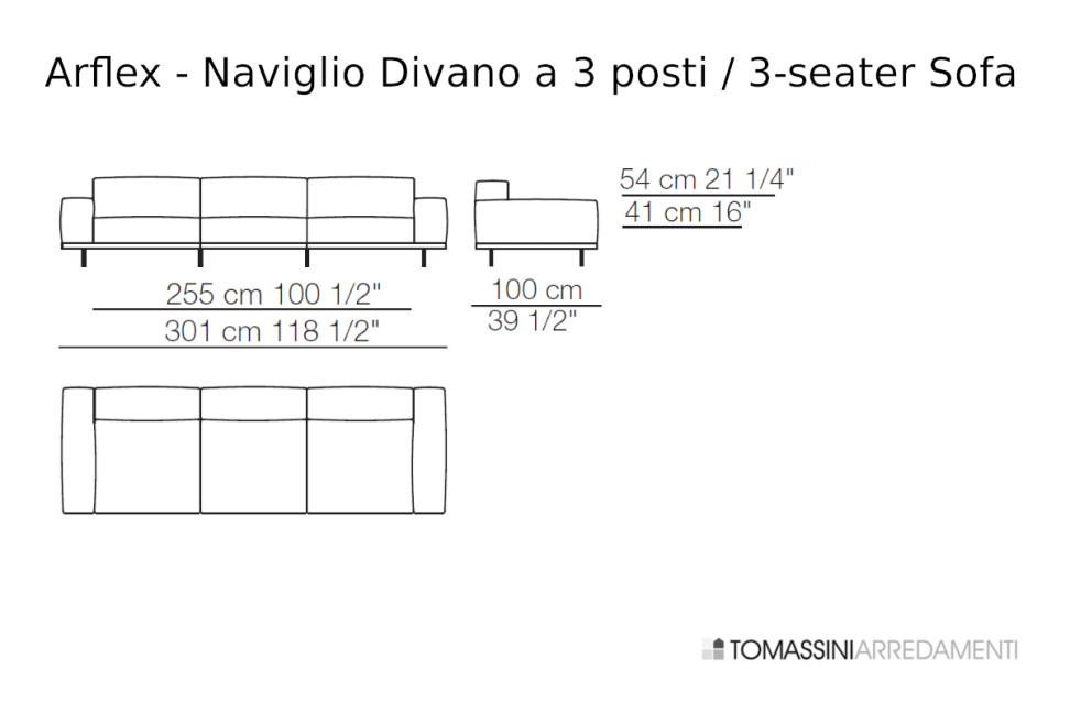 The Naviglio Sofa is available in different linear sizes. Among these: