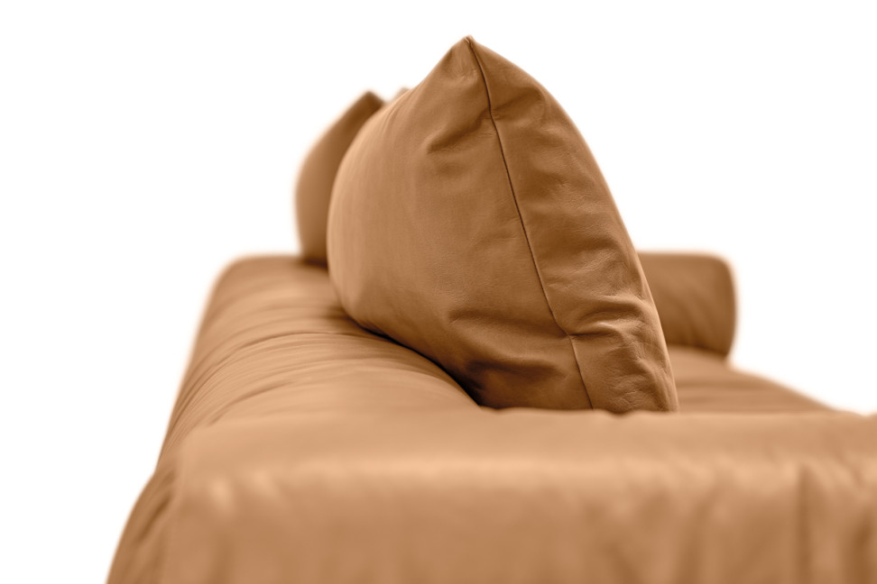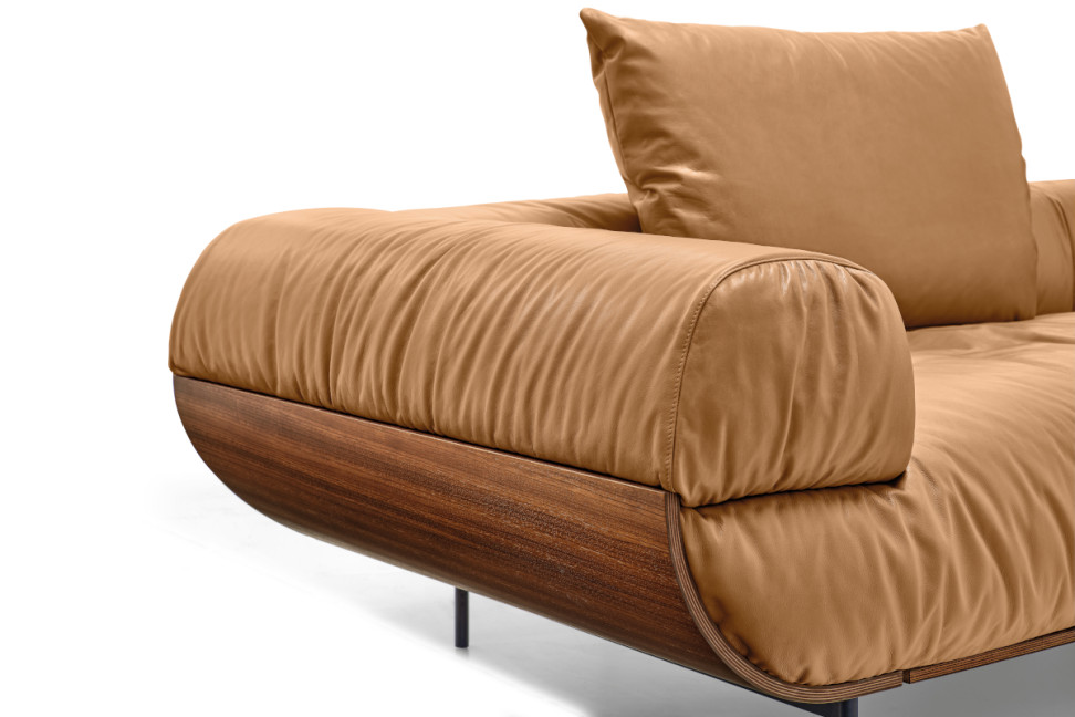 This sofa is a place that allows freedom of expression and respects materials, showing their unique love and value. The fluid lines created by the zebrano or eucalyptus wood molds along the base cradle the soft cushions upholstered in leather or ruched fabric. It is a true hymn to love, an ode to fast love that goes beyond fleetingness and focuses on instant falling in love.