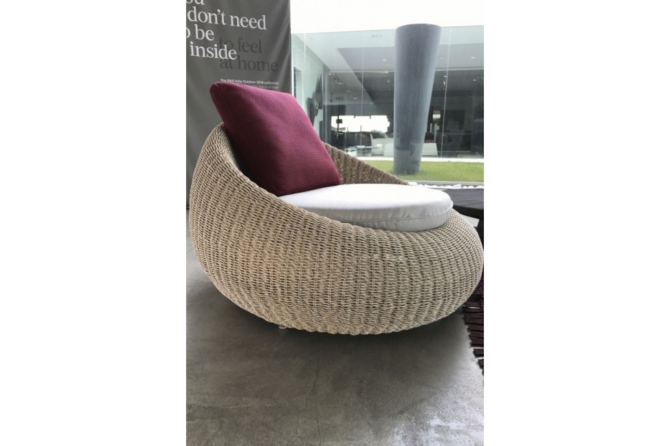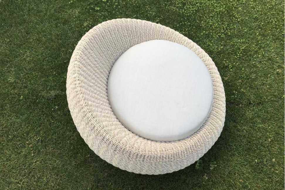 The Twiga outdoor armchair, in expo offer in our showroom, features a particular beige polyethylene weave that highlights the round seat cushion in white fabric.