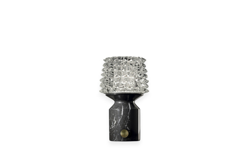Despite its small dimension, Camparino is a perfect expression of one of the glass manufacturing techniques in the Barovier tradition invented in 1938 by Ercole Barovier, that is the rostrum. At the same time, the lamp turns out to be a cutting-edge technological object, as it is equipped with special devices, such as the lithium battery and the contactless charging system, which allow you to transport and regulate the lamp at distance. Camparino is composed of a base in Carrara White or Black Belgium marble which highlights the elegant glass rostral lampshade.