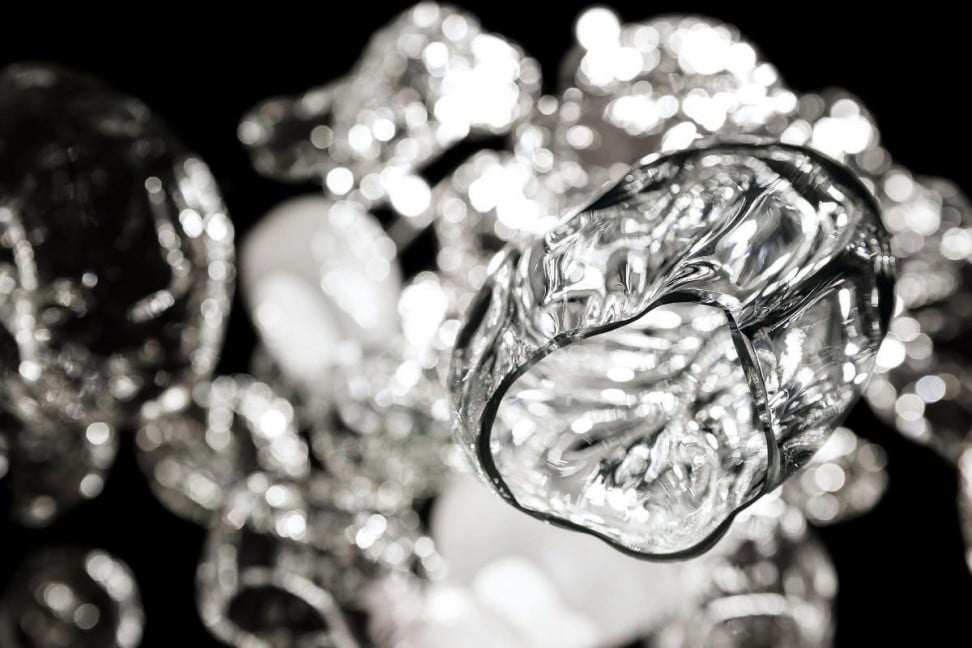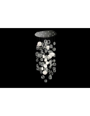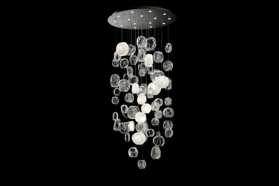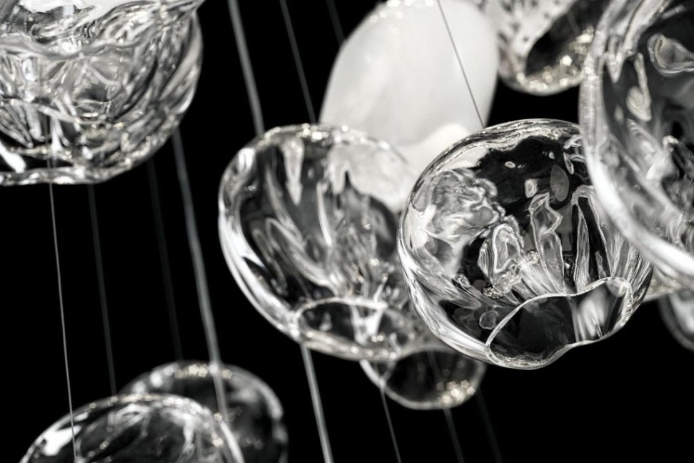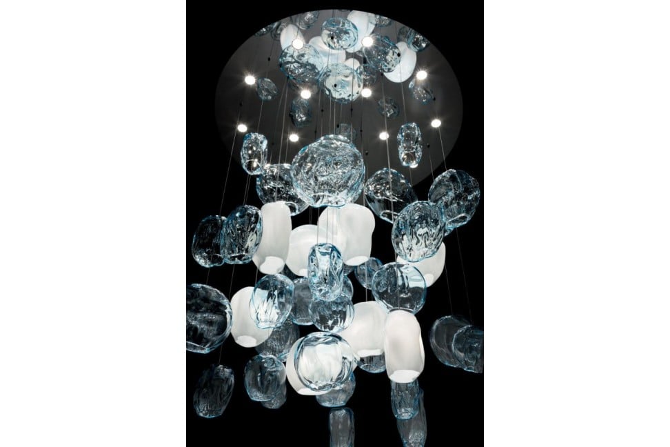 The Hanami ceiling lamp is an eye-catching piece of furniture designed by the luxury lighting brand Barovier&Toso that creates a luminous dance in the environment through a Murano glass waterfall.Hanami is, in fact, composed of blown glass bubbles connected by cables of different sizes that elegantly fall down creating compositions with an unreal charm. The bubbles in transparent, aquamarine, green or gray colors are alternated with matt white bubbles and illuminated from within by LED spotlights which, together with those embedded in the chrome metal ceiling plate, are reflected on the glass surfaces creating unique and evocative games of light. Hanami comes in five models that differ in size and number of cables.