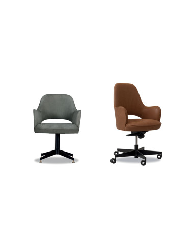 The office version takes the sleek and enveloping design from the Colette chair. The Colette Office chair seat has similar features to those which made famous the Colette chair, with its soft and rounded lines, but it is innovative for the ultimate comfort of the seat, filled in differentiated density polyurethane foam. The backrest comes with an inside structure in multilayered birch wood, and there is also the possibility of having a swivel base in black varnished metal, with fixed brass feet or castors. Colette Office main feature is its lining made of high quality leather. Baxter offers the possibility to make the countour of the chair in a different shade of leather, as well as the possibility of making the seat and the back in two different colors.