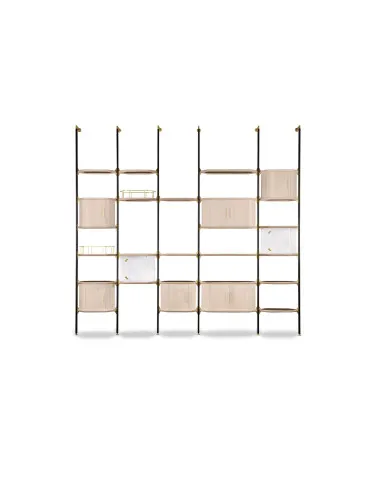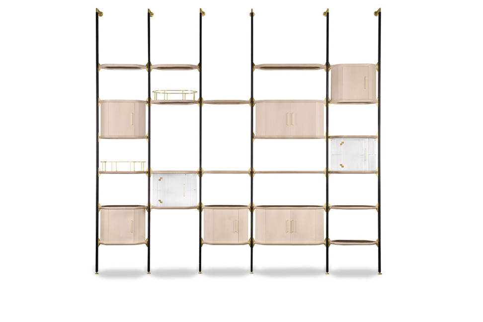 The Libelle bookcase recalls a dragonfly and its ethereal lightness thanks to its design and its name borrowed from the German language. The Libelle bookcase is a modular one, and it can be made both in the wall and the ceiling version. The thin but durable matt black varnished metal frame is fastened with elegant satin brass pins, also used for shelves supports. The shelves can have a black stained maple structure with inside in cane, a frame in natural maple with inside in black cane or a refined leather lining. Baxter makes this modular bookcase even more versatile, allowing you to add a storage ring in satin brass, only available for leather-covered shelves. It is possible to make the Libelle modular bookcase in different heights and with the number of shelves you want, giving this way the possibility to adapt to a wide variety of home and contract environments.