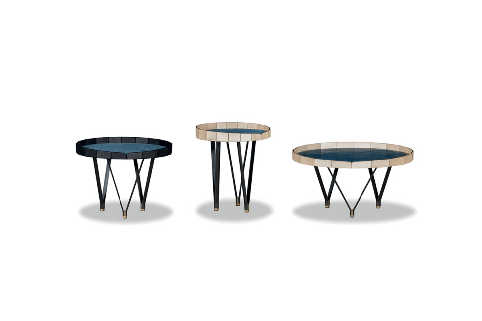 Pietro Russo conceives every piece of furniture as part of a scenic environment, and he rediscovers craft techniques for their realization, being particularly in line with the workflow that characterizes Baxter. Ninfea consists of four small tables of different shapes and sizes. There is no doubt that the coffee table with internal compartments stands out among the collection, which can also be used in a sophisticated sleeping quarter as a nightstand. The base of the tables is made of black metal and satin brass, while the wooden structure is available in natural maple or dyed with black aniline. The top can be either made of wood as the structure or covered in leather.