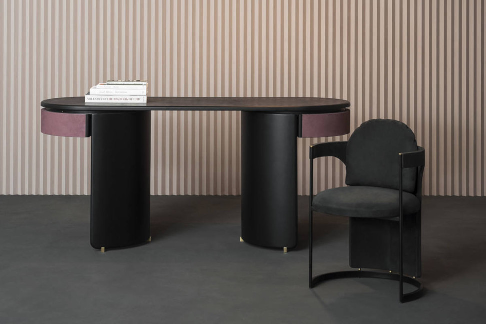 This console has a matt black lacquered MDF top with rounded corners, covered in leather in the upper part; the legs, which are configured as hollowed columns, are proposed with matt black lacquered finish for the outside and covered in leather on the inside. This piece of furniture is also enriched with satin brass details. Parsec is also available in the desk version, with wider legs and top, equipped with two round side swivel drawers.