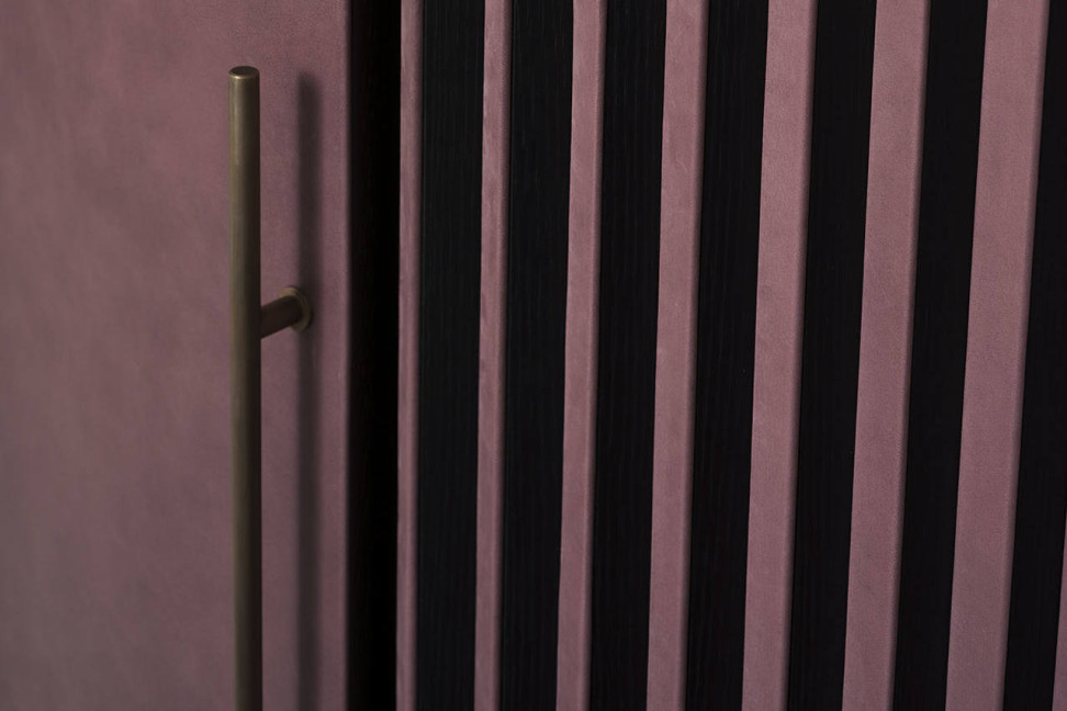 Created with the combination of black stained oak and natural maple, Plissé is partly covered with leather or triangular pleated inserts, and it completed by handles and feet in hand-brushed burnished metal.