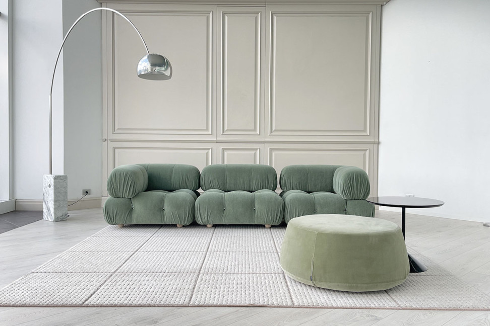 The Camaleonda sofa on expo offer in our showroom is a linear composition consisting of three elements, with two armrests and three backrests total. The sofa is upholstered in a fine sage green light fabric, which lends character and personality to the room without sacrificing refinement and harmony of tone. Rounded feet in natural beech accentuate the sense of warmth and coziness of the seat. The inserts are in polished chrome-plated steel.