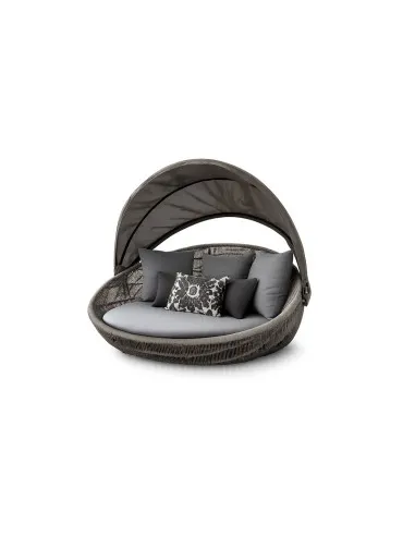 Structure and canopy in dove gray. Cushion cover for seat, back cushions, and two decorative cushions in anthracite fabric. One decorative cushion in fabric with a gray and white floral pattern.