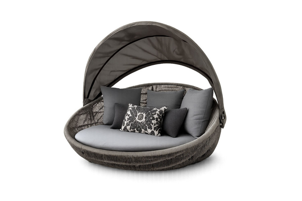 The B&B Italia Outdoor Canasta ’13 Round Sofa, designed by Patricia Urquiola, is an outdoor seating characterized by the iconic lightweight weaving and the foldable canopy that provides protection from the sun.