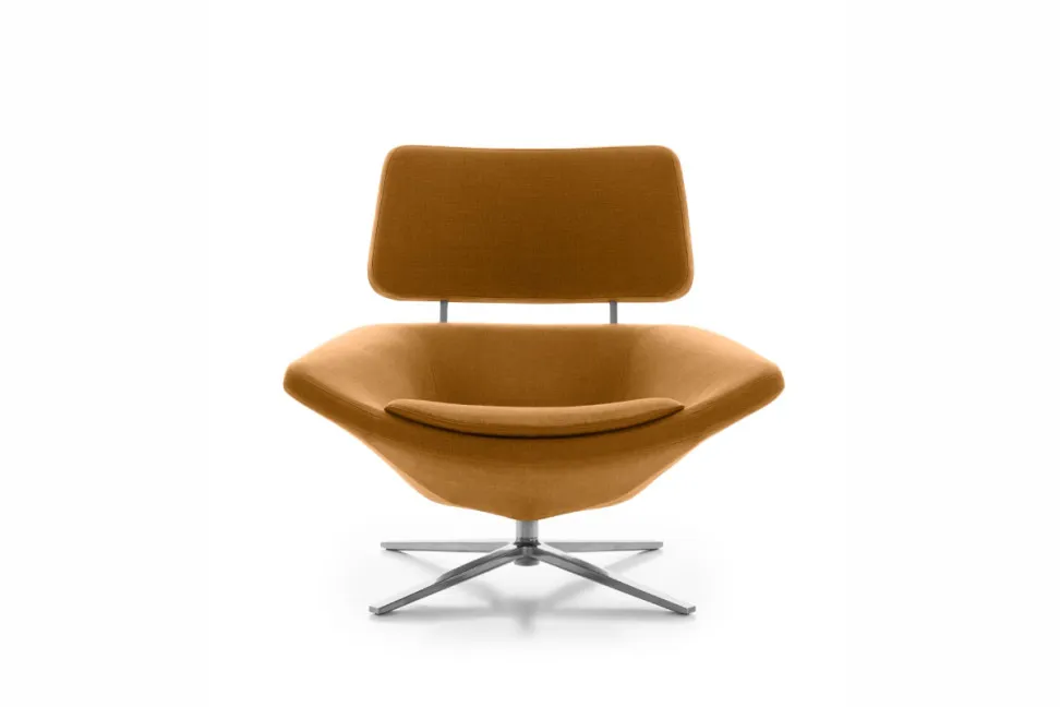 The Metropolitan Relax Armchair by Jeffrey Bernett for B&B Italia stands out for the continuity between the seat and armrests, which gives it a fluid and harmonious appearance. The armchair is swivel and available in two versions: one with a four-spoke aluminum base and the other with a disc base. Both options are made of polished brushed aluminum or bronzed nickel-plated aluminum, giving the armchair an elegant and contemporary look.