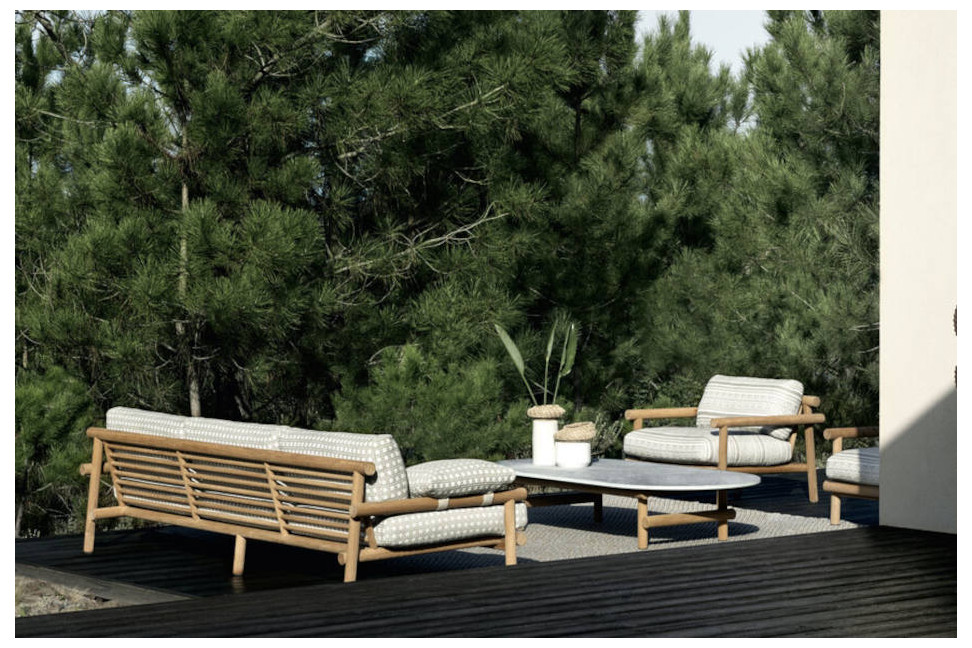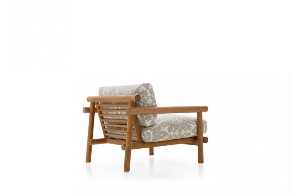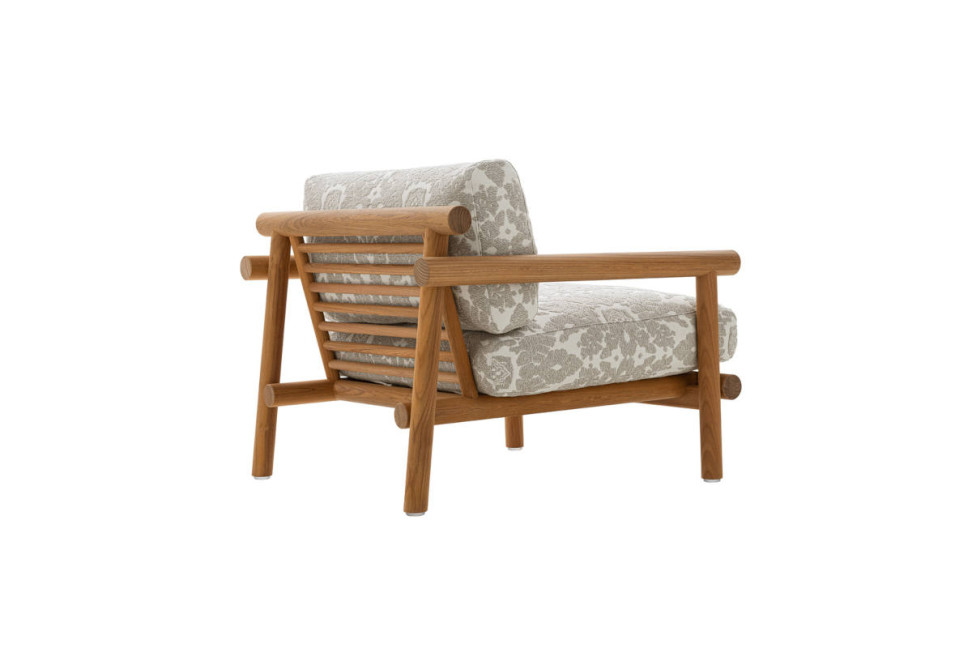 On the one hand, Ayana refers to Southeast Asia tradition, in the depths and heights of the structure, while the backrest recalls a Swedish wall bar, an exercise equipment turned here into a load-bearing element. Thanks to the minimalist design of its teak structure, this armchair represents a piece of furniture that can be enjoyed at 360 degrees. The armrests and padded cushions guarantee a comfortable seat and various removable covers can be selected from a wide range of waterproof fabrics.