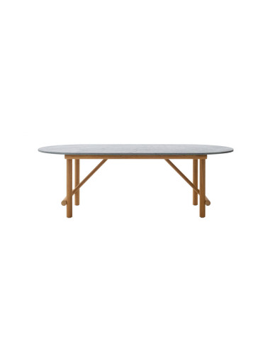 In this table the interplay of intersections and lines of the natural teak structure is connected with the oval shape of the top; the structure, apparently light, is actually extremely robust, weather resistant and able to support the heavy top in Serpentino, a typical stone of the Alps. The Ayana dining table can be combined with the Ayana chairs, for a complete and original design of your outdoor environment.