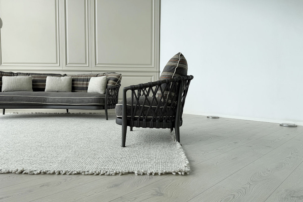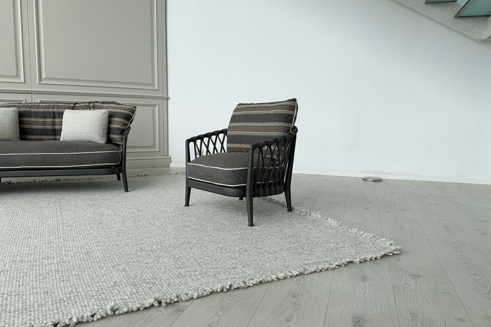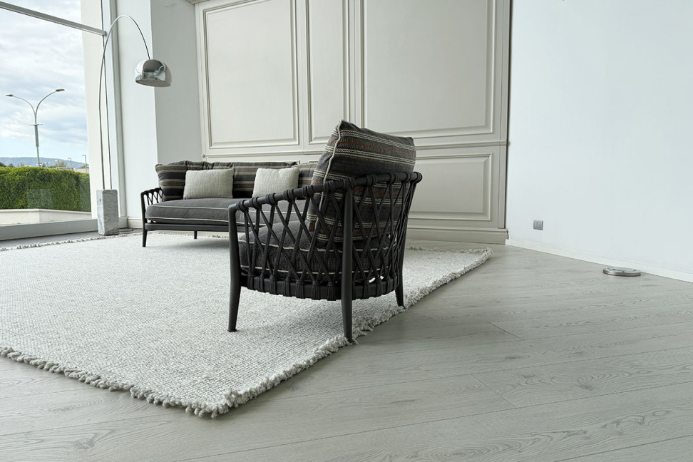 The Erica Outdoor Armchair on expo offer in our showroom has a low backrest, a practical anthracite painted aluminium frame, and anthracite polypropylene fibre weave. The seat cushion is upholstered in dark grey fabric with contrasting white hatching, while the back cushion is in striped fabric in grey, orange, off-white, khaki, and blue.