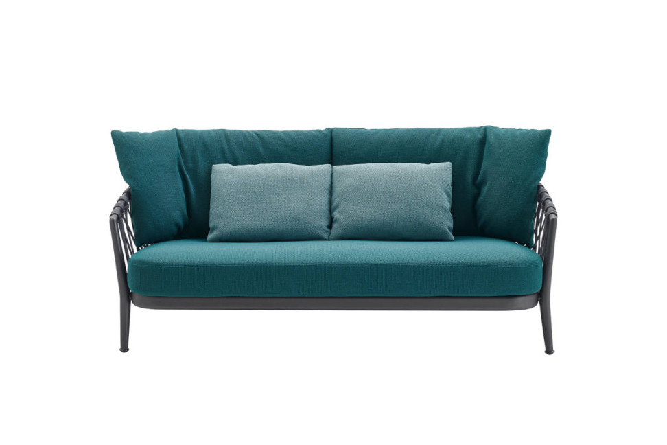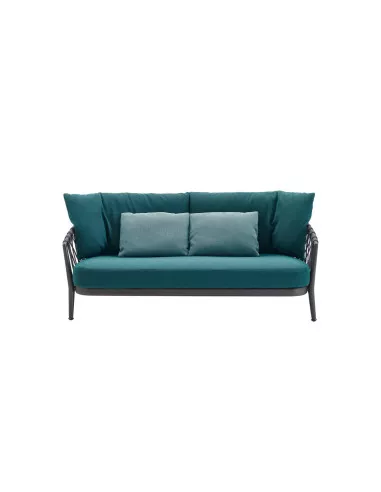 The seat and backrest cushions add a touch of luxury to the Erica outdoor sofa, offering an inviting oasis of relaxation. Attention to detail is evident in both the aesthetics and functionality of the design, creating a space where elegance marries practicality. The sofa's structures are available in three different finishes, allowing for customization to blend with the surrounding context. The woven polypropylene tape, equipped with a high-tenacity inner core designed to withstand extreme weather conditions, not only adds a distinctive aesthetic touch but also imparts the robustness and resistance required for prolonged outdoor use.