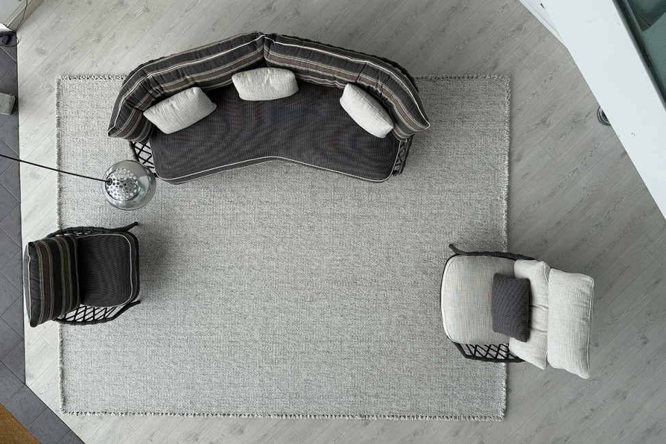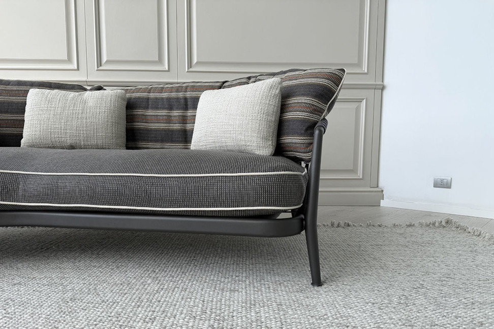 The Erica Putdoor Sofa on offer in our showroom has an elegant and practical anthracite-painted aluminium frame and anthracite polypropylene fibre weave. The seat cushion is upholstered in fabric from the B&B Outdoor collection in anthracite colour with contrasting white hatching, and is combined with a multi-coloured striped fabric for the back cushion.