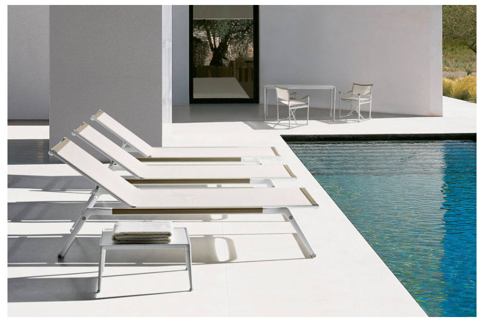 The Mirto outdoor sunbed by B&B Italia Outdoor, inspired by designer Antonio Citterio, embodies a fusion of timeless elegance and lasting robustness.