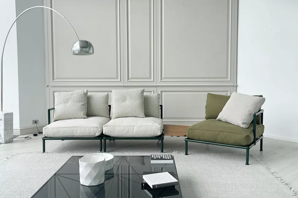 The sofa is upholstered half in ivory-colored fabric with olive-green details, the other half is in olive-green fabric. The frame is made of green-colored aluminum