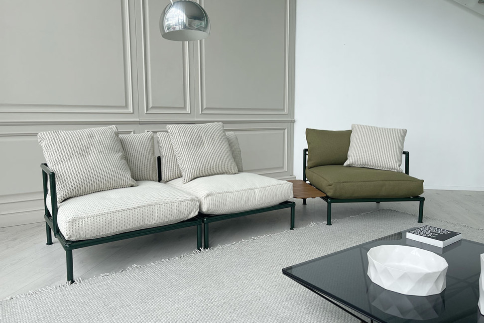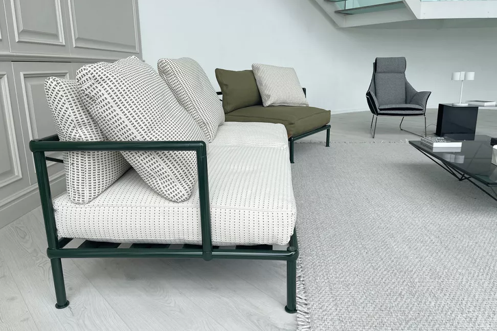The Nooch outdoor sofa on expo offer in our showroom consists of a left-end element, a center element, a trapezoidal top, and a right-end element. The frame is made of semi-gloss painted aluminum in green color. The left side of the sofa is upholstered in ivory-colored fabric with olive-green details, while the right side is upholstered in olive-green fabric. No. 3 optional cushions in ivory-colored fabric with olive-green details are included in the offer.