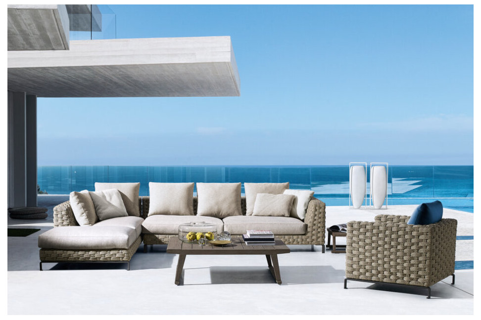 The Ray Outdoor Natural Sofa reinterprets the elegance of the indoor collection with a rope weave inspired by natural abaca, offering a refined and resistant solution, perfectly designed for outdoor use.
