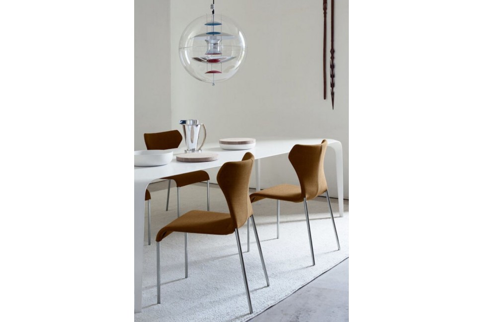 The Papilio chair, inspired by the Papilio Armchair, stands out for its perfect formal balance, achieved through the consistent thickness of the shell and the seat's graceful lines. The metal zipper on the back adds an elegant decorative detail.