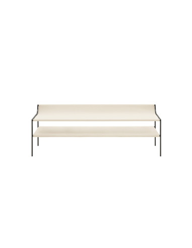 The Quiet Lines bench features a metal frame and two padded shelves covered in leather. Thanks to its leather sling surface beneath the seat, the bench offers a convenient storage space for objects such as blankets, bed runners, or bedroom slippers.