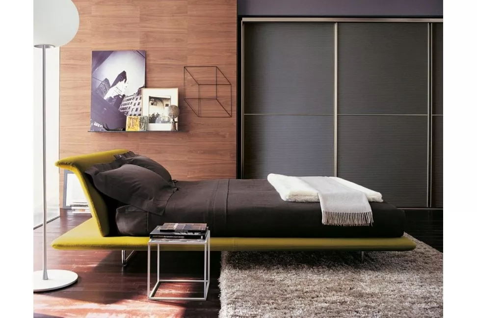 The base frame of the Siena bed contains a metal grid with curved beech wood slats. The top of the back panel inserted into the base has a short turned-up section where you can rest your arm comfortably when you are seated. Two tubular metal supports hold up the frame. B&B Italia makes it also available in an equipped with wheels version, that facilitate movement. The upholstery is available in fabric or leather.