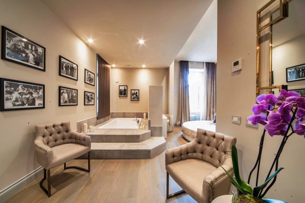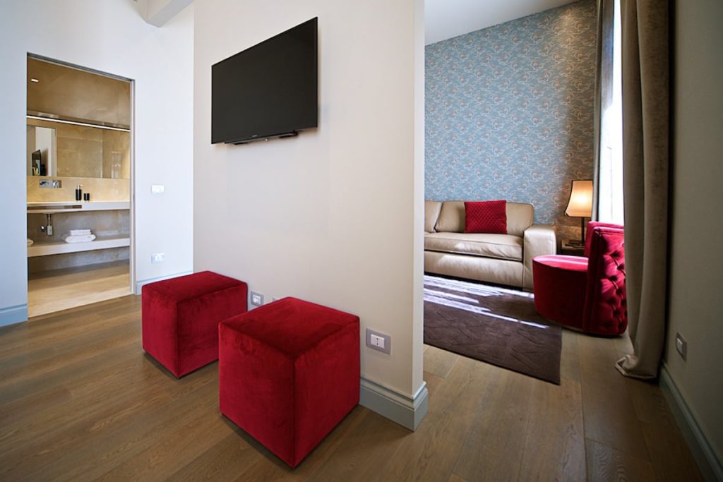 Upon entering, an immediately refined atmosphere is breathed in: sumptuous fabrics and meticulously designed furnishings accompany guests through all the spaces. Each room is distinct from the others, identified by colorful details or unique furniture elements. Nothing is left to chance; everything is designed to provide a welcoming and relaxing stay.