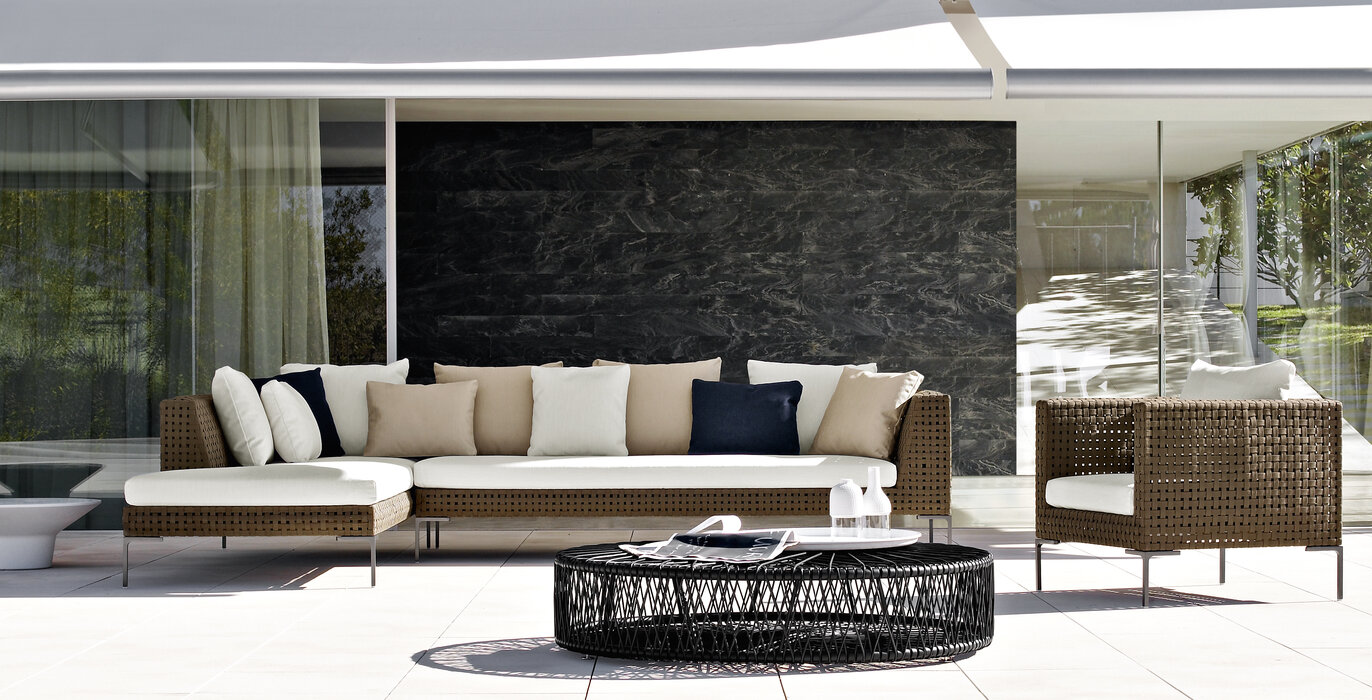 The range of sofas, terminal elements, and chaise-longue pieces - made up of 9 elements of various styles and sizes - expands with a small armchair and a reclining cot. The dove brown bands match the fabric covers of the seat cushions. The three sizes of back cushions can mirror the neutral shade of the frame or coordinate with lively, brilliant colors from the new outdoor fabric collection. To improve and guarantee greater protection from the weather, B&B Italia has treated all fabrics in the collection, as well as those used for the internal part of the cushions, with advanced water-repellent techniques.