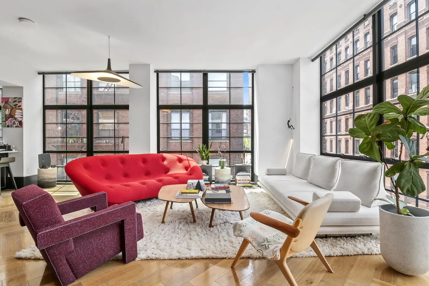 The colours black, white and red mix with the warm shades of the parquet floor in a visual choreography that captures the essence of Brooklyn, reflecting its dynamic and creative spirit. Even the shapes of the furniture have been carefully chosen: sofas with soft lines contrast with chairs and armchairs with an edge design. This unexpected mix of shapes and colours makes the house perfectly suited to the inexhaustible and ever-changing energy of New York.