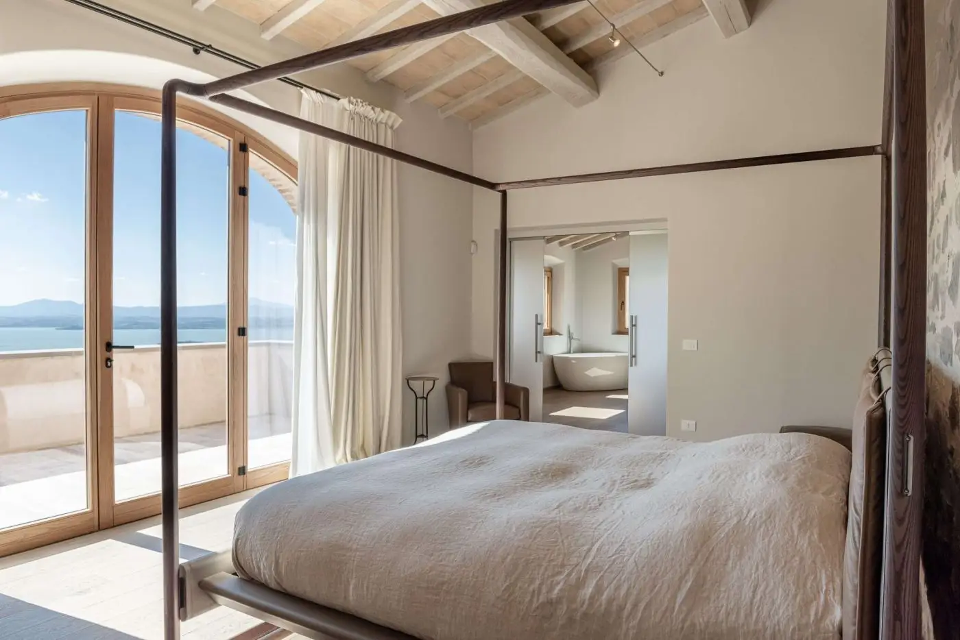 The stone walls, characteristic of the original country house, have been preserved to maintain its authentic charm. The spacious rooms have been designed to ensure a harmonious flow between the environments, while the generous windows have been strategically positioned to take advantage of the splendid view of Lake Trasimeno, contributing to the creation of an elegant and welcoming atmosphere.