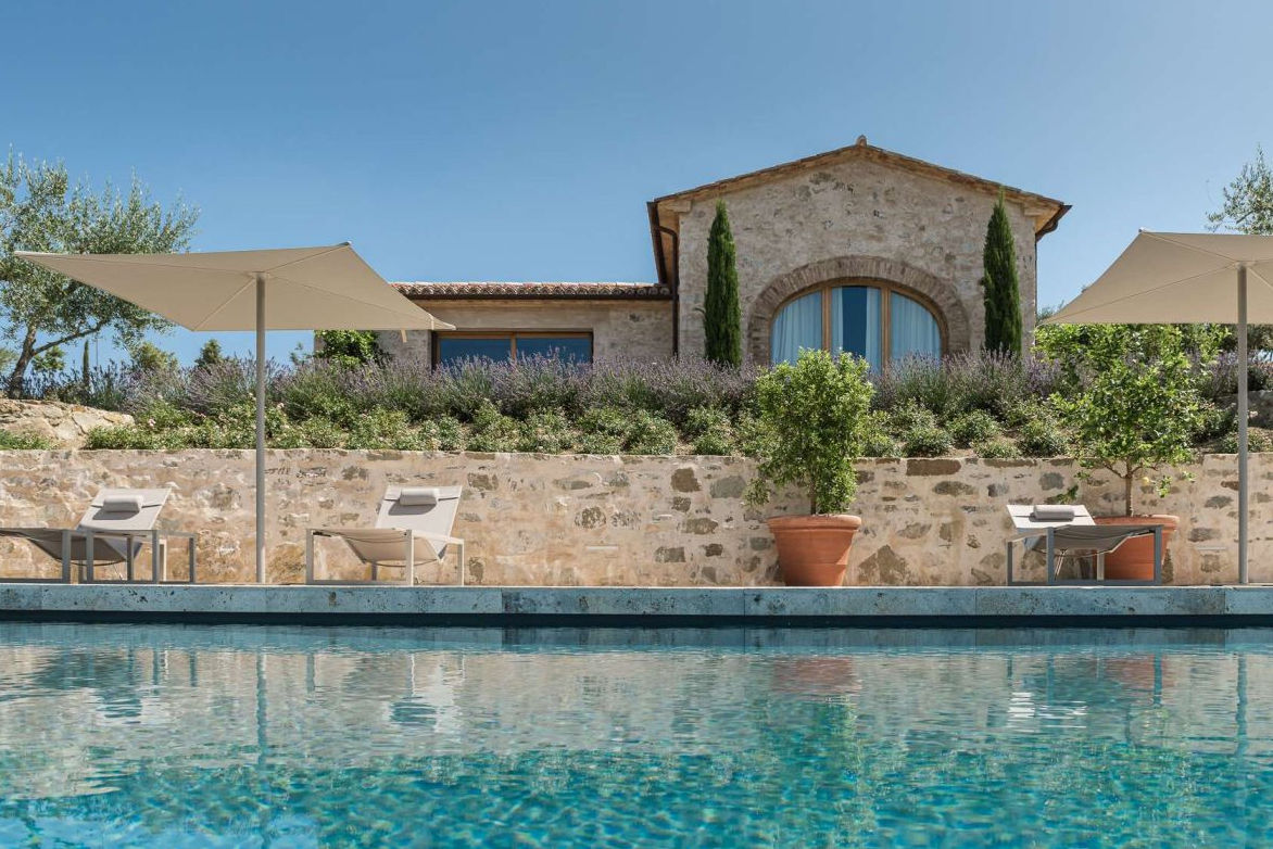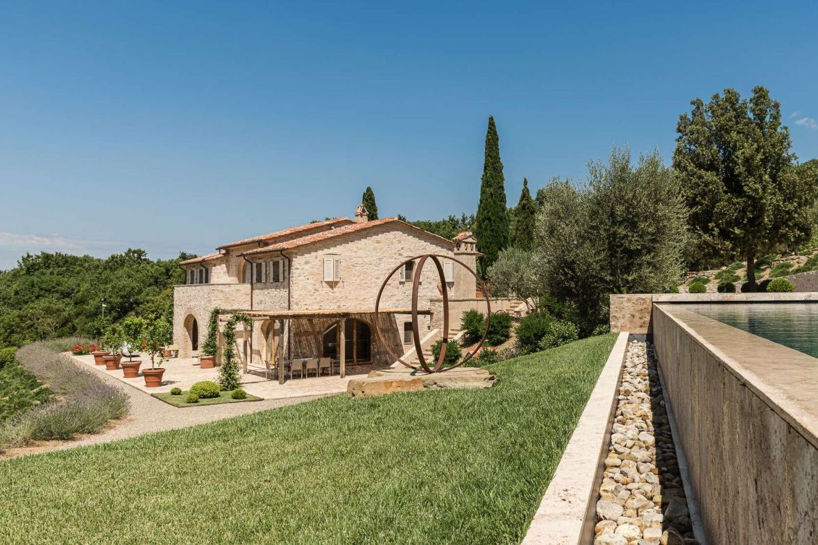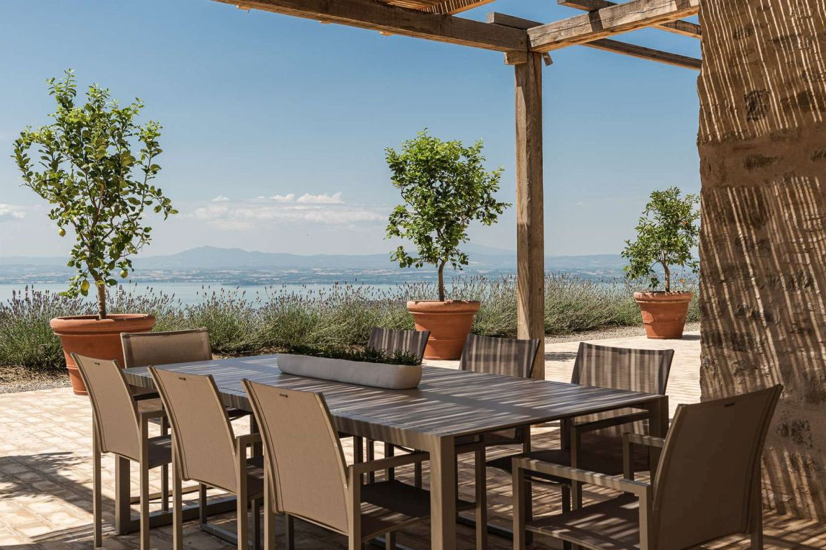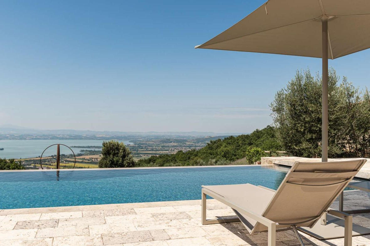 The stone walls, characteristic of the original country house, have been preserved to maintain its authentic charm. The spacious rooms have been designed to ensure a harmonious flow between the environments, while the generous windows have been strategically positioned to take advantage of the splendid view of Lake Trasimeno, contributing to the creation of an elegant and welcoming atmosphere.