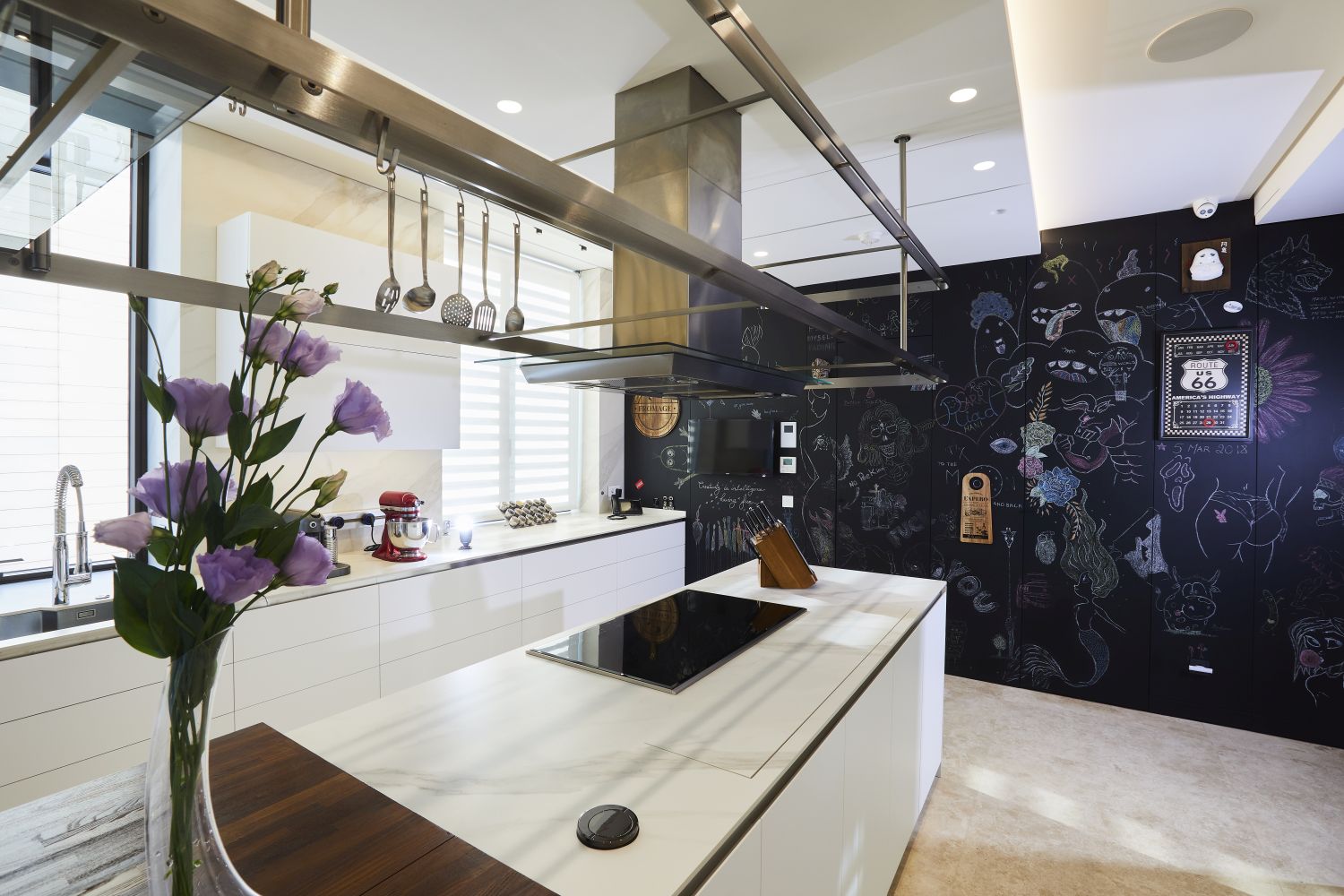 In this project, the combination of modern materials such as steel and polycarbonate with surprising and irregular shapes has created an environment that exudes modernity in every detail. The spacious kitchen becomes the focal point of the apartment, dominating the space with its monochromatic elegance. The living space is bathed in a bright white, creating a spacious and elegant atmosphere.