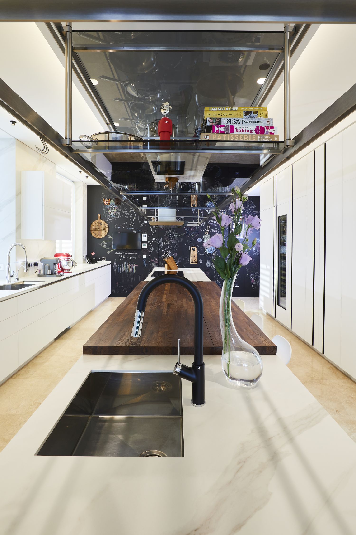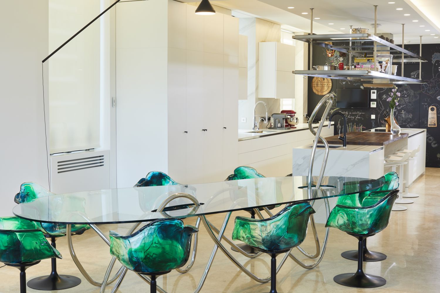 In this project, the combination of modern materials such as steel and polycarbonate with surprising and irregular shapes has created an environment that exudes modernity in every detail. The spacious kitchen becomes the focal point of the apartment, dominating the space with its monochromatic elegance. The living space is bathed in a bright white, creating a spacious and elegant atmosphere.