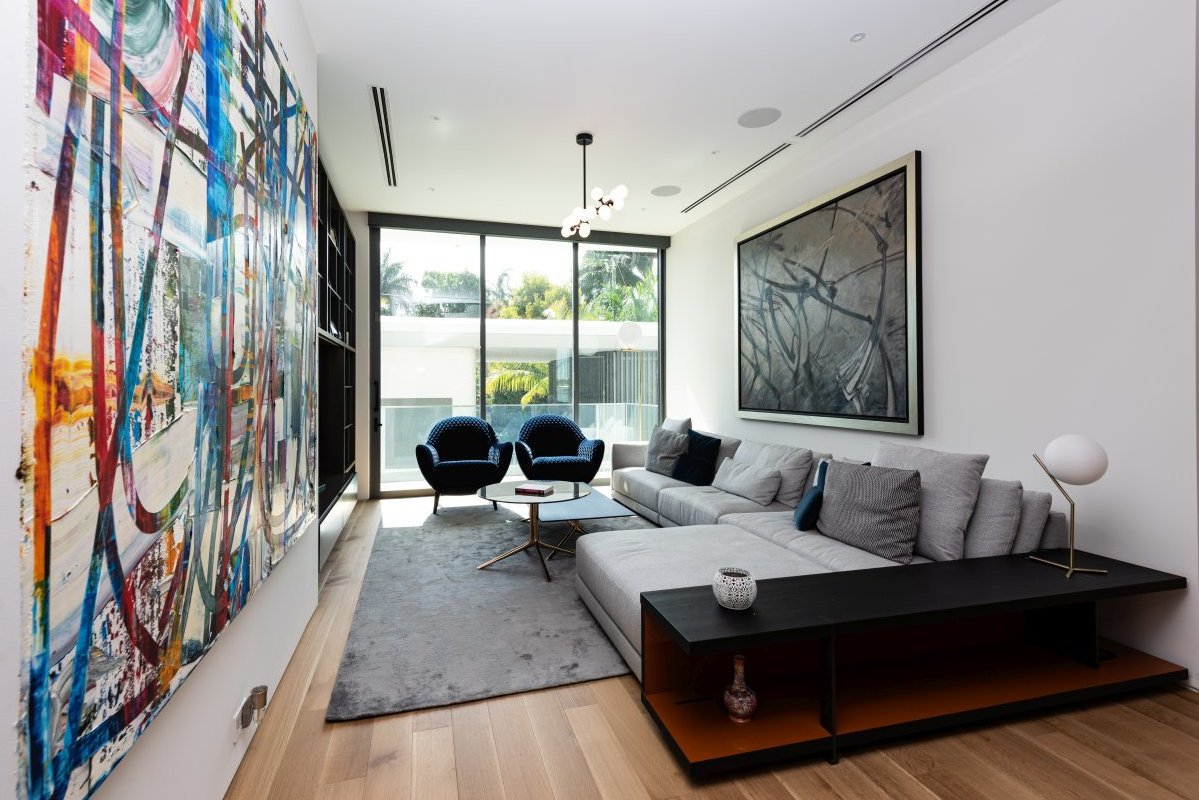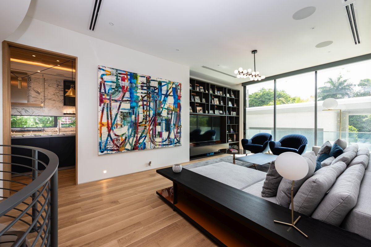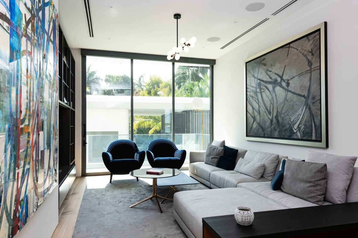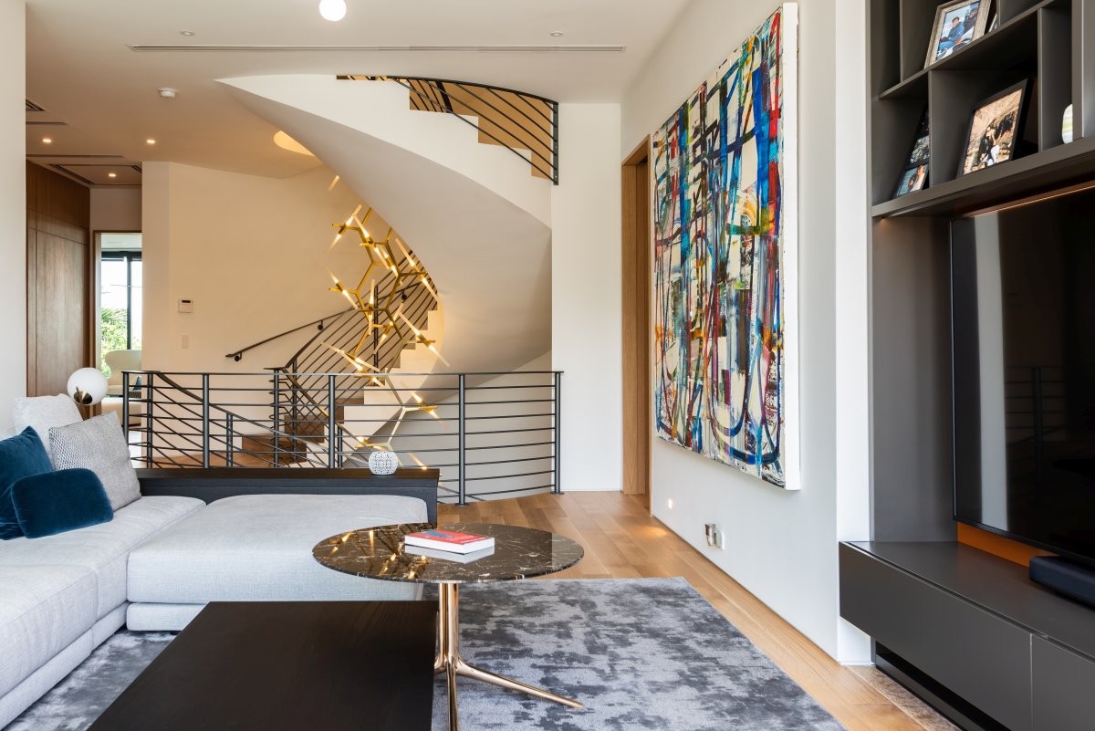 Lighting plays a key role in setting the atmosphere of this house: strategically positioned light spots highlight distinctive features of the each piece of furniture. The soft colours of the walls and furniture awaken with hints of blue and teal from the armchairs and the artworks on the walls.