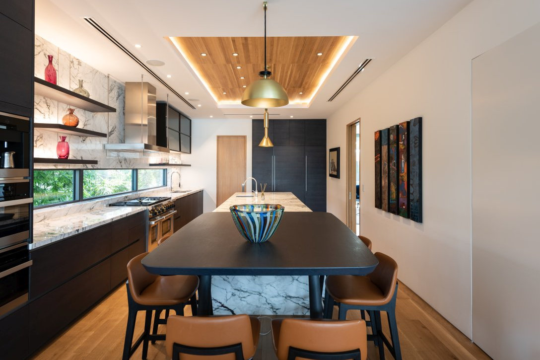 The interior design of this apartment is one of the latest project developed by Tomassini Arredamenti in collaboration with the designer Michel Colaço. The furniture seamlessly blend in synergy with the artworks on the walls: the result is a deep connection between art and design. The kitchen is undoubtedly the heart of this house. The snack counter and kitchen walls are covered in marble: a perfect mix of luxury and modernity.
