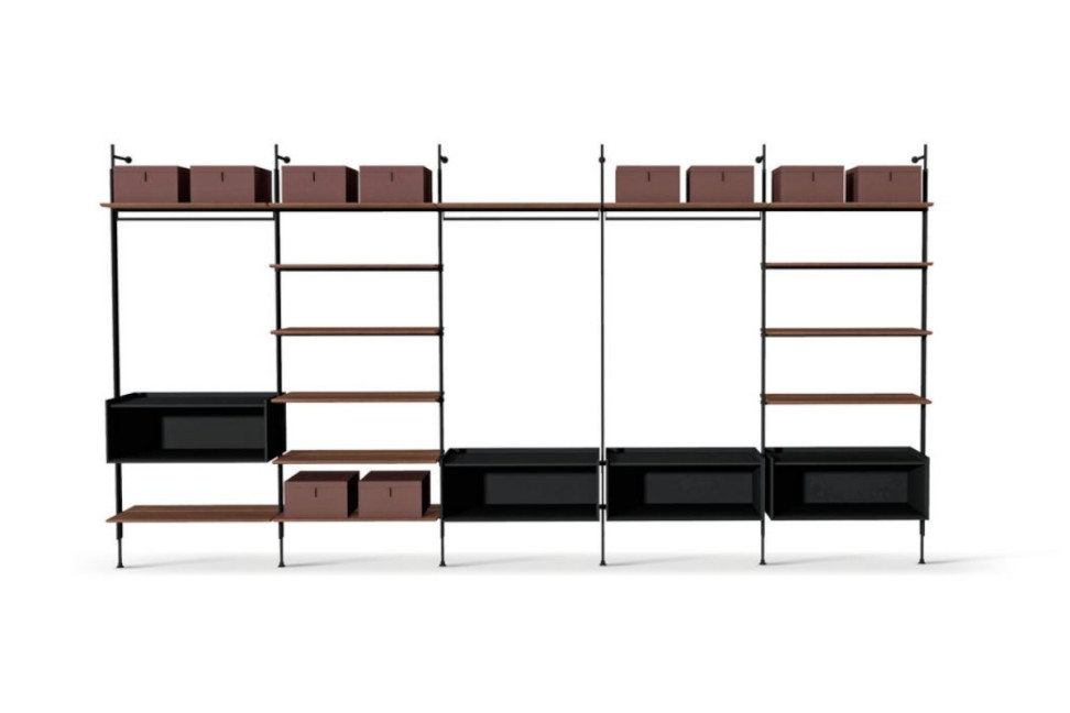 The cabin structure is made of lead, providing solidity and stability, while the shelves and boxes are available in two variants: lead-coloured lacquered wood or Canaletto walnut, creating a fascinating contrast. This product offers endless possibilities for customisation.