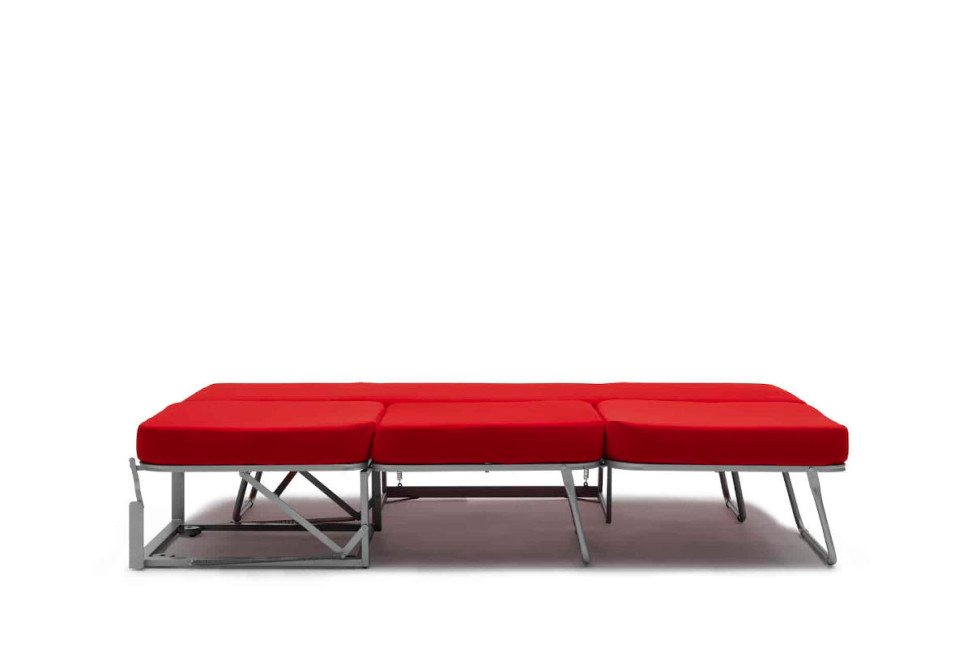 The Oops armchair bed by Campeggi, designed by Giulio Manzoni, is a comfortable seat that can be transformed into a pouf, a single bed, and a bedside table or into two single beds when needed.
