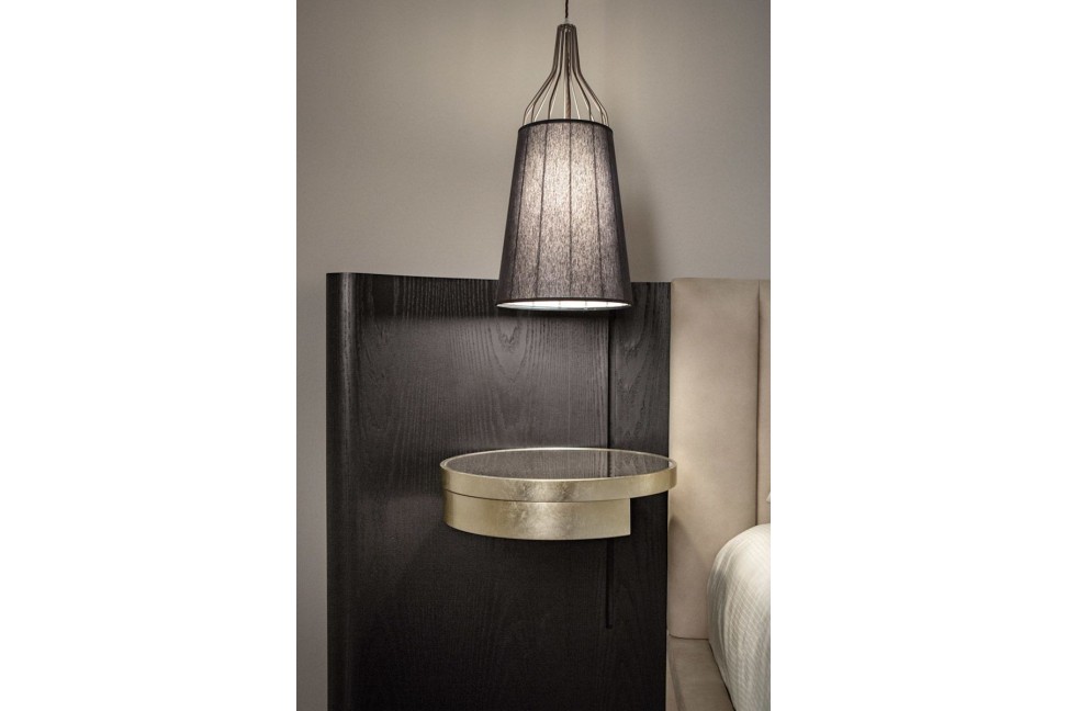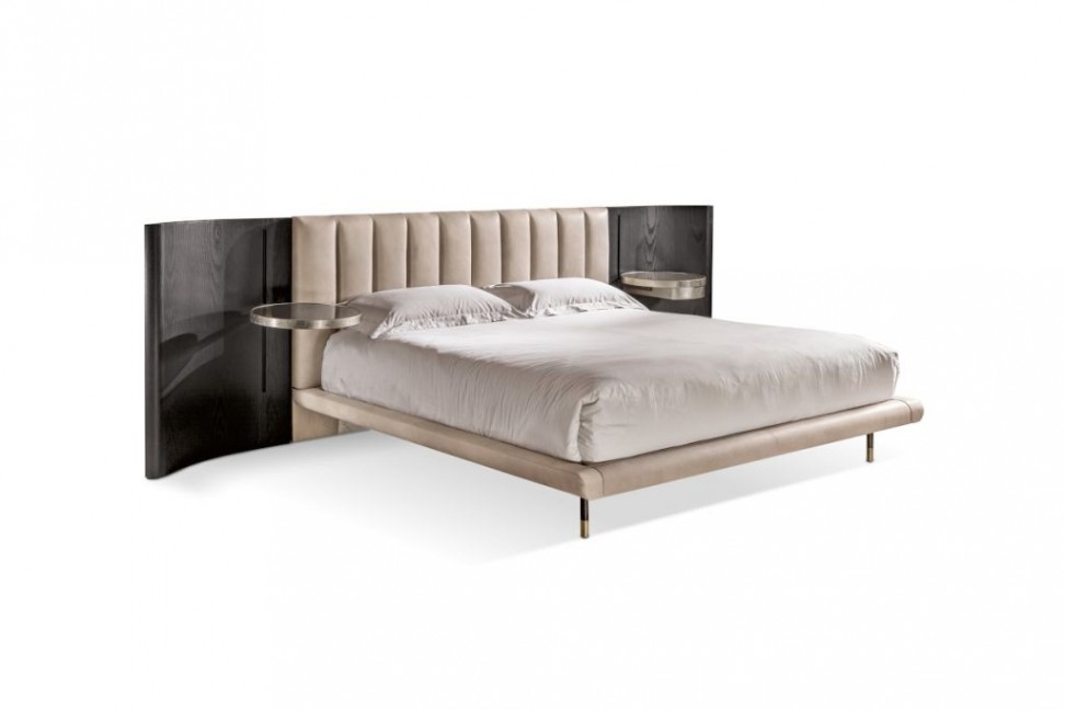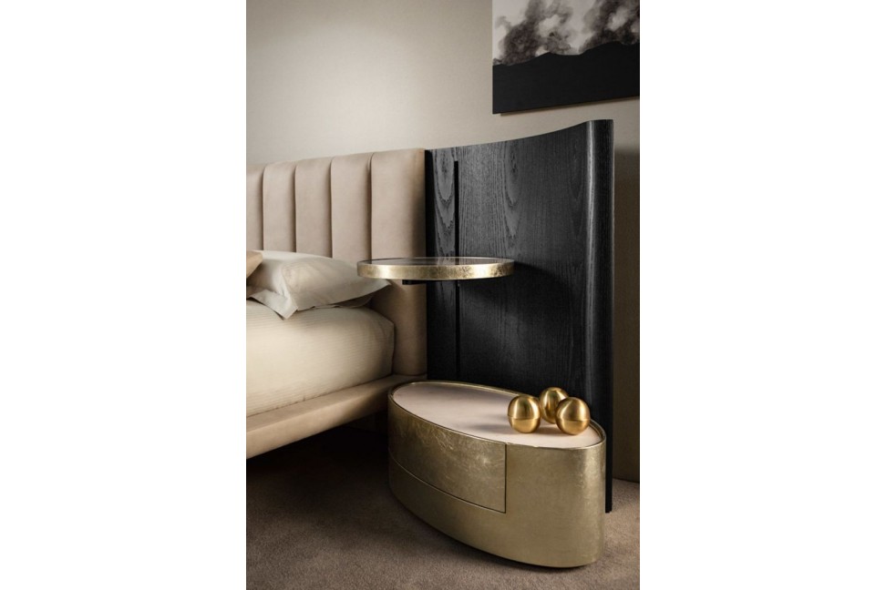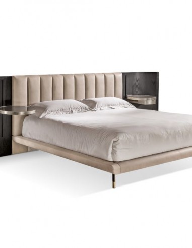 Mirage is the elegant bed proposed by the Made in Italy brand Cantori. The characterizing element of this bed is the headboard, wide and slightly curved, which envelops it in an ideal embrace and contributes to make this space welcoming. The structure of the headboard is in wood and is enriched in the central part by a padding covered in fabric or leather. The bed frame is also padded and upholstered, while the feet are in metal. The Mirage bed is equipped with two rotating shelves inserted in the headboard, which represent two comfortable support elements.