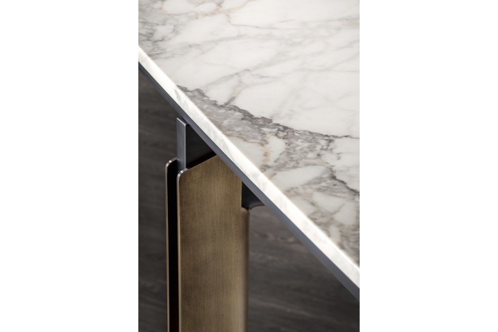 Mirage is part of the collection of tables proposed by the Cantori brand. This table is characterized by the particular processing of the legs, made with single blocks of hollowed metal. The top is in marble, stone or wood, and the legs are proposed in a patinated bronze finish. The Mirage table is available in various sizes.