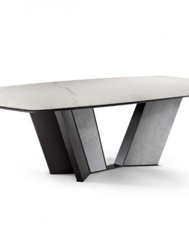 The Prisma table is one of the creations of the artisans of the Cantori brand. This table is characterized by the perspective symmetries of the V-shaped base, composed of a metal frame, decorated in different finishes. Prisma is proposed with a ceramic or screen-printed glass top.