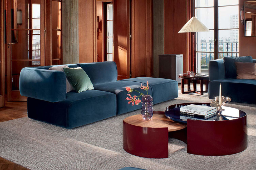 To complement the collection, Cassina offers a series of coordinated coffee tables that echo the rounded shapes of the sofa: bases in glossy painted aluminum in amaranth color and tops in canaletto walnut, ideal for creating fluid and personalized compositions.
