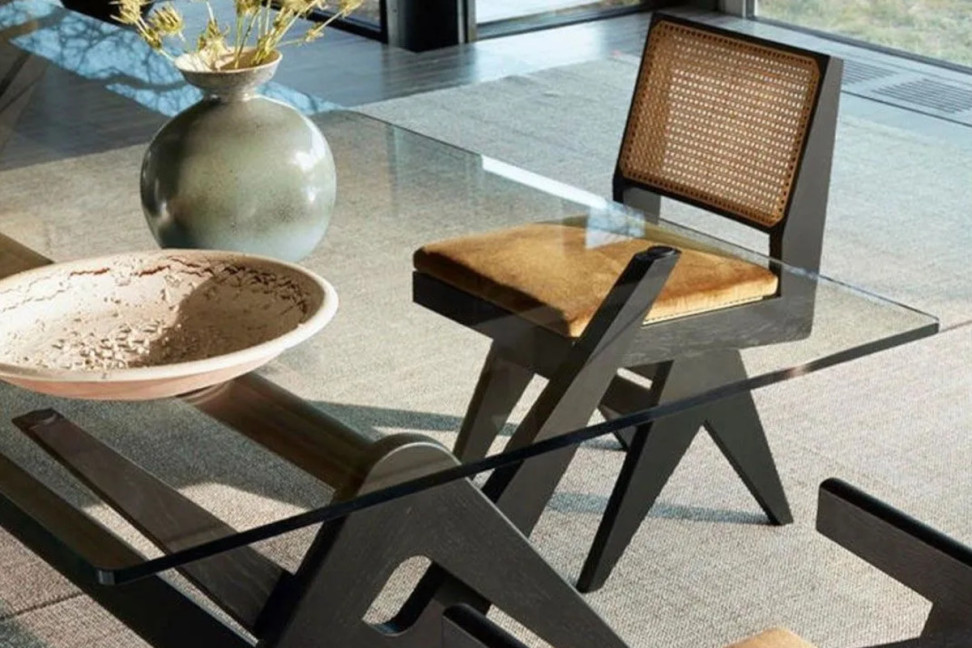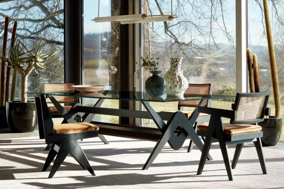 The Capitol Complex Chair by Cassina, designed by Pierre Jeanneret, reissues the original from Chandigarh with a solid wood structure and a hand-woven Vienna straw seat.