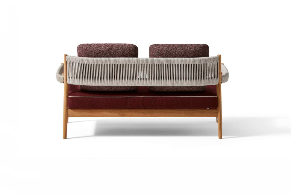 Designer Rodolfo Dordoni creates the Dine Out sofa for Cassina, with a natural solid teak wood frame with Orbettino rope armrests and backrests. Complemented by two back cushions, the Dine Out sofa is extremely cozy and comfortable thanks to the padded seat cushion with a polyurethane foam insert. Perfect for spending relaxing moments outdoors, this sofa can be upholstered in a wide range of outdoor fabrics with an optional grosgrain profile.
