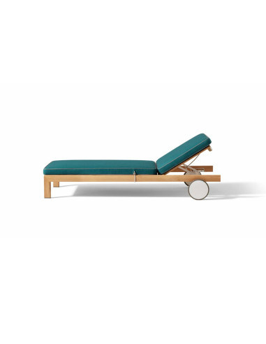 Unlike other outdoor loungers, the Lie Out outdoor sunbed stands out for its unique features. The two rear wheels allow for easy movement, while the three reclining positions provide personalized comfort. The solid teak slats add a touch of elegance and durability, and the mattress, padded with polyurethane foam and covered with water-repellent fabric, ensures practicality and longevity. The grey gros-grain profile and toggle button not only enhance its aesthetic appeal but also ensure the mattress's stability, making Lie Out an essential piece for those who wish to enjoy outdoor living without compromising on luxury and comfort.