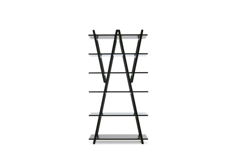 The Nuvola Rossa library by Cassina, designed by Vico Magistretti, reinterprets the traditional library with a foldable wooden structure and diagonal bracing that eliminates the side panels.